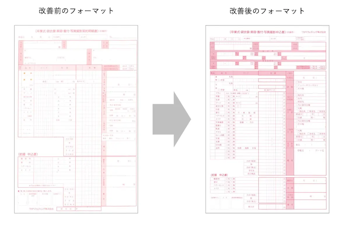 改善後のフォーマットでは、全ての項目を1枚に集約・統合し、メモ書きのように帳票の空いたスペースにスタッフが記入をしないよう、様々な工夫を凝らしました。「持参」のことを、「自前」「ご自前」「お持ち込み」などと複数の表現があるケースもありましたが、フリー記述の項目をなるべく減らして、チェック項目に置き換えるなどの対応を行いました。