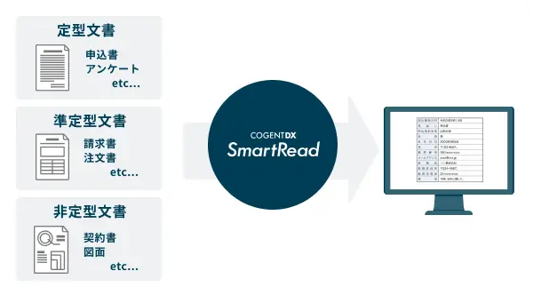 取引先やお客様から受領する注文書や申込書、あるいは社内用資料など、様々な文書から必要な情報を抽出しデータ化します。定型文書だけでなく準定型文書、非定型文書にも対応しています。