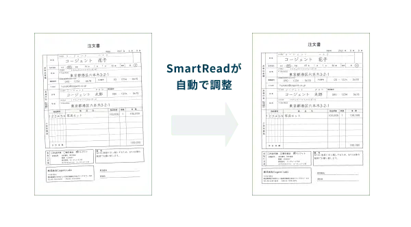 文書の向きや傾き、歪みを自動で検出・補正します。電子化(スキャン)した時に文書の向きがバラバラだったり、FAXで受け取った歪みや縮小のある文書も、通常と同じプロセスだけで読み取りを実行できます。