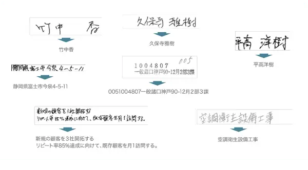 様々な文書から活字も手書きも高精度に読み取り、データ化します。文書に傾きや歪み、ノイズがあっても高い精度を維持します。