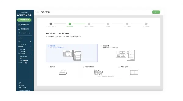 SmartReadでは文書の仕分け機能が標準装備されています。仕分けたい文書のテンプレートを「タスク」に登録しておくだけで仕分け処理の設定が完了し、読み取り機能と併せていつでも利用できます。