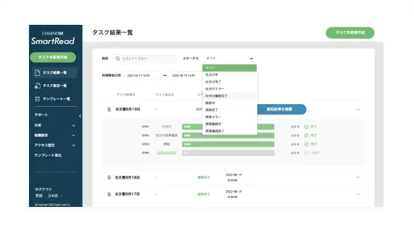 作成したテンプレートやタスク、読取り結果は一覧で表示・管理でき、検索機能や絞込み機能もあるため目的のものをすぐに見つけることができます。結果一覧では進行ステータスがタイムリーに表示されます。