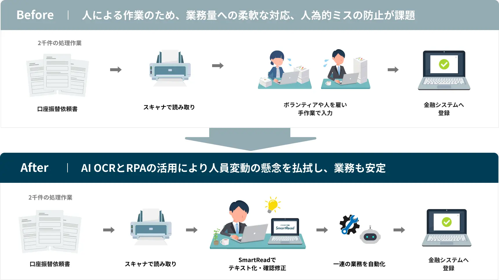 特定時期に増える書類の受領に伴って、データエントリーの作業が増加し、多くの人手と時間を費やしている